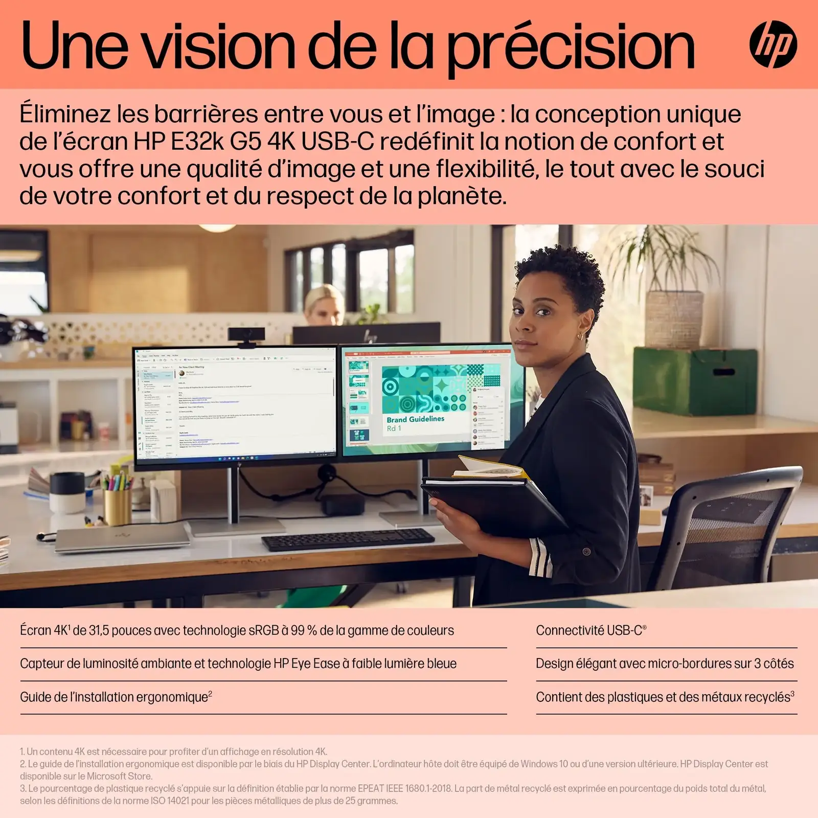 - Conçu pour offrir des images incroyables et une flexibilité sur mesure, l’écran USB-C 4K HP E32k G5 donne un nouveau sens à la précision, pour que rien ne vous empêche de donner le meilleur de vous-même. Élaboré dans un souci de confort et de respect de la planète, cet écran 4K est un concentré de productivité.