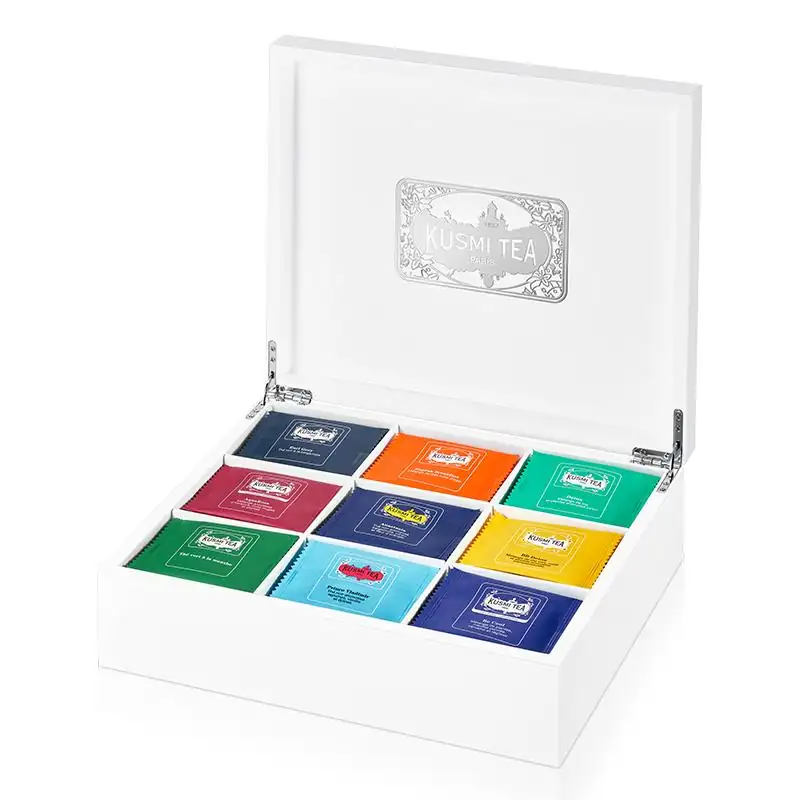 Kusmi Tea propose un coffret en bois laqué blanc, aux lignes lisses et épurées et aux finitions argentées. Un coffret précieux et intemporel de 9 cases pouvant accueillir 90 sachets enveloppés au choix.