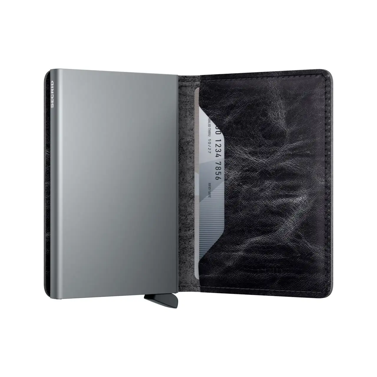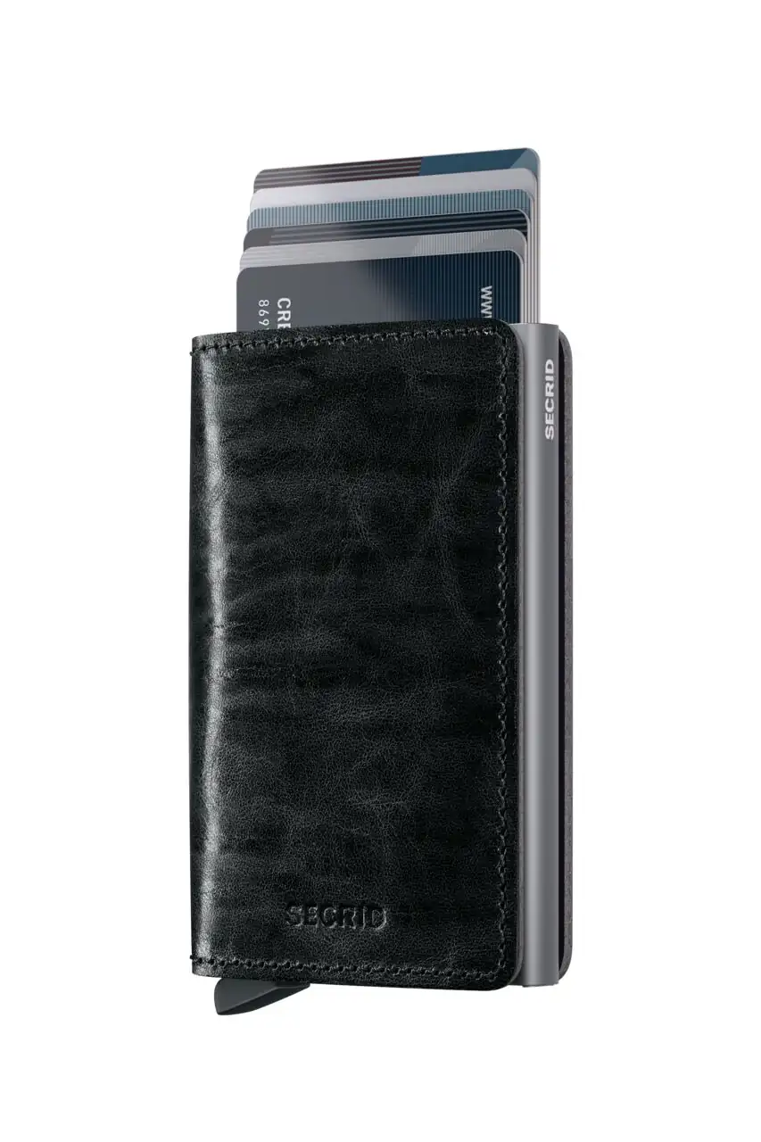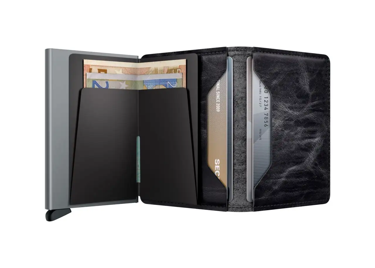 Le Slimwallet est la version moderne des portefeuilles classiques. Il est assez fin pour se glisser parfaitement dans toutes les poches. Grâce à la coupe généreuse de son cuir, il peut abriter au moins six cartes supplémentaires, des billets et des cartes de visite. Le mécanisme breveté vous permet d’éjecter vos cartes d’un geste simple, et de les utiliser aussitôt. L’aluminium évite que vos cartes se plient ou se cassent et empêche tout détournement de données. Ciré, huilé et graissé, il offre un fini transpa