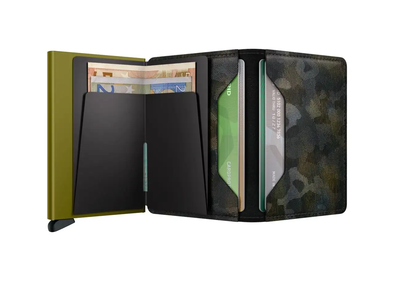 "Le Slimwallet Jungle Moss est la version moderne des portefeuilles classiques. Il est assez fin pour se glisser parfaitement dans toutes les poches. Grâce à la coupe généreuse de son cuir, il peut abriter au moins six cartes supplémentaires, des billets et des cartes de visite. Le mécanisme breveté vous permet d’éjecter vos cartes d’un geste simple, et de les utiliser aussitôt. L’aluminium évite que vos cartes se plient ou se cassent et empêche tout détournement de données. Remarquable relief de camouflage multicolore, fabriqué à partir de cuir de vachette européen de haute qualité. Dans ce porte-carte, vous pouvez ranger jusqu'à 6 cartes et, sous le ""Cardprotector"" se trouve une partie en plastique pliable pour y mettre des billets."