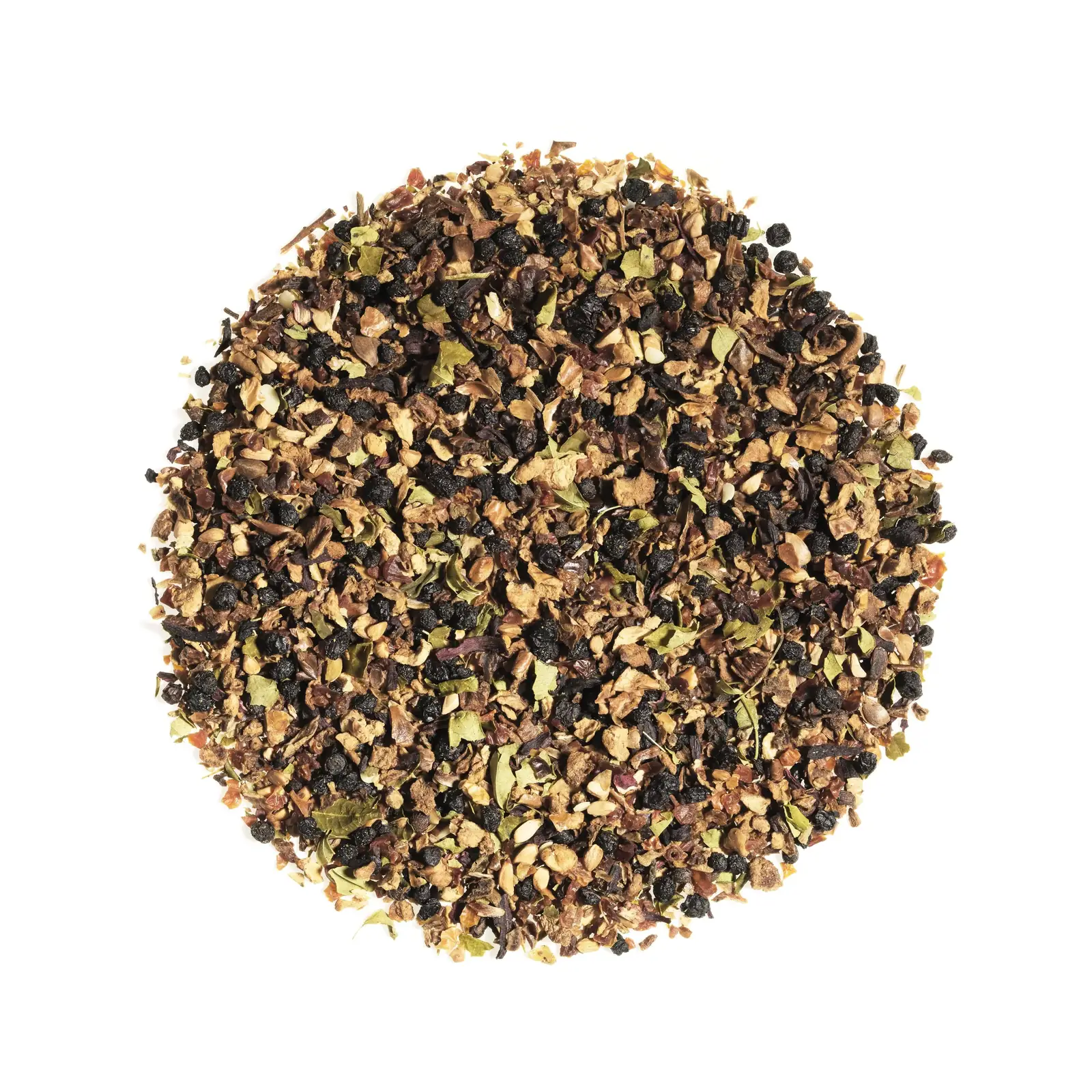 - *Produits issus de l'agriculture biologique. Pomme*, cynorhodon*, sureau*, hibiscus* (10%), myrtilles*, moringa*, arômes naturels de fruits rouges (3%), arôme naturel de céréales (2,5%), arôme naturel de caramel*Produits issus de l'agriculture biologique