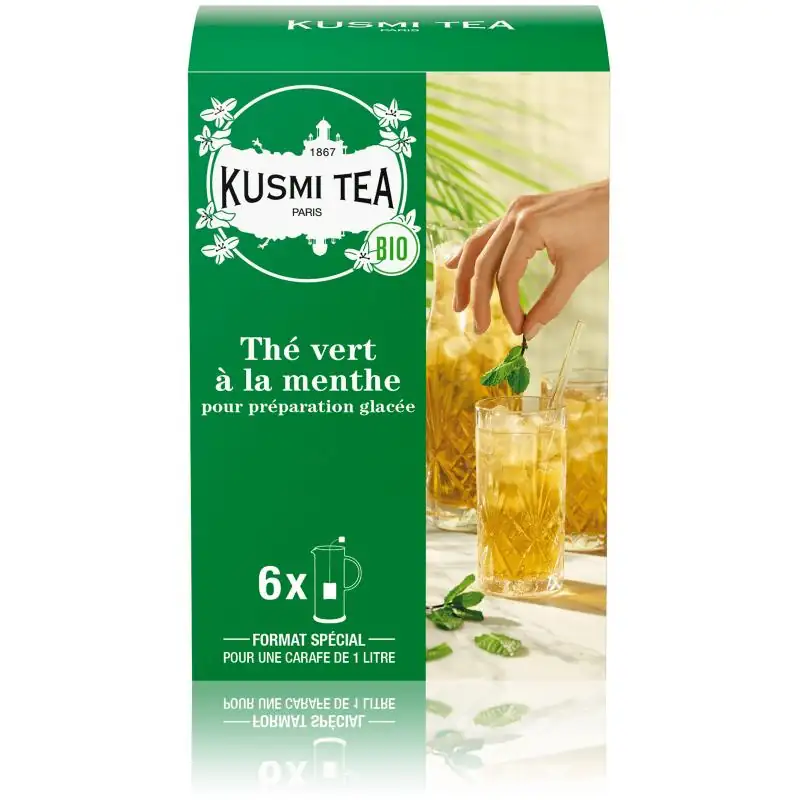 Kusmi Tea Vert Menthe Bio - Etui carton 6 grands sachets pour thé glacé - 48 gr