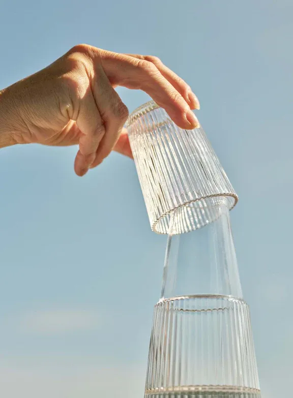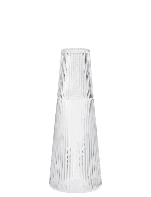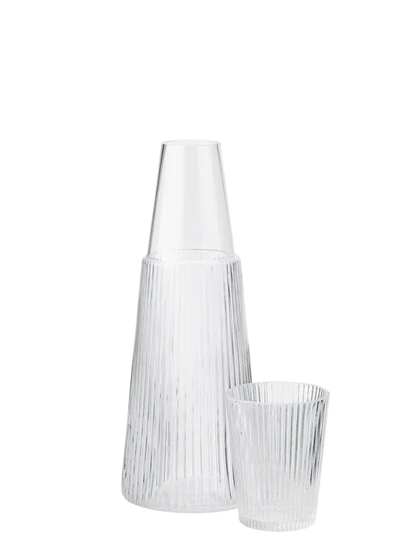 La série Pilastro est conçue par Francis Cayouette en s’inspirant du style Art déco élégant et fonctionnel des années 1920, qui dominait à l’époque le monde de l’architecture et du design. La série se compose de verres à boire, de bols de service et d’un refroidisseur à vin et s’agrandit maintenant avec cette belle carafe. La nouvelle carafe Pilastro avec le verre qui l’accompagne a la même expression sophistiquée, le même langage de design épuré et la même surface rainurée que les produits existants de la série. La carafe peut contenir 1 l et est livrée avec un verre plus petit de 15 cl qui sert également de couvercle